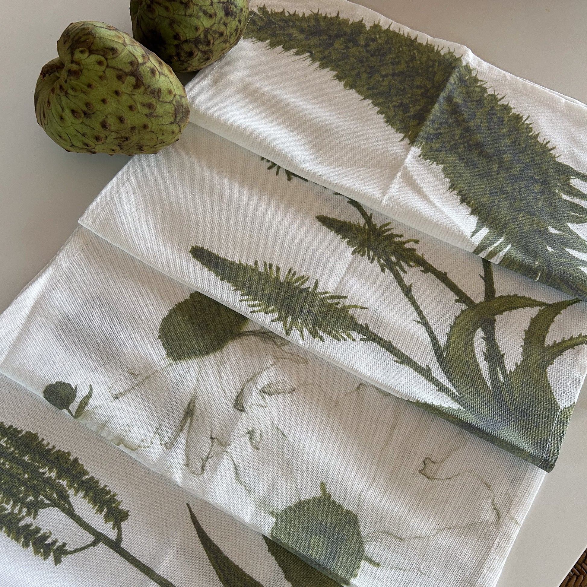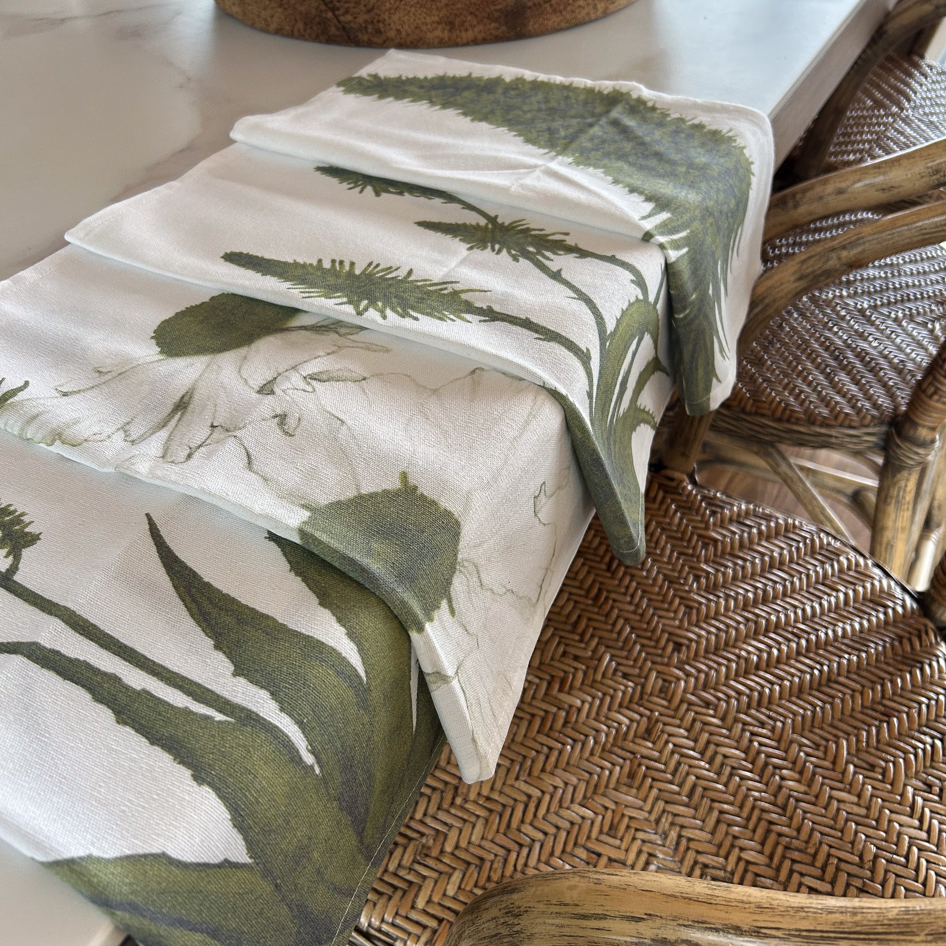 Pack de 4 servilletas de lino con rayón color blanco, estampadas en tono verde oliva con ilustraciones de equium, romneya y aloe vera. Su color natural y suave invita a una mesa armónica y orgánica.