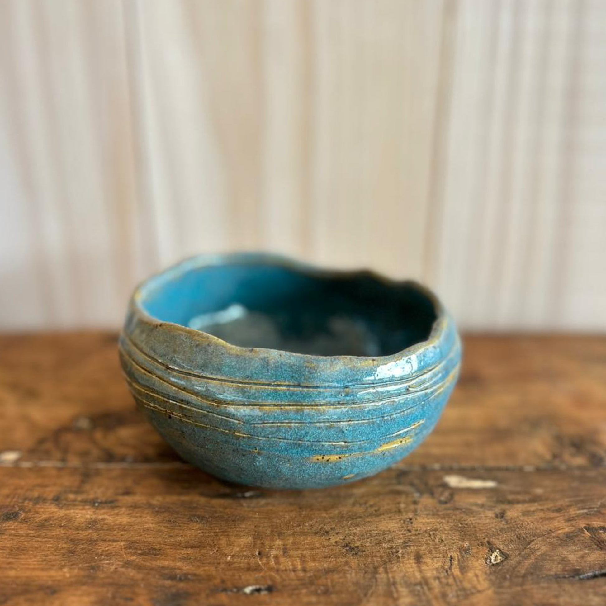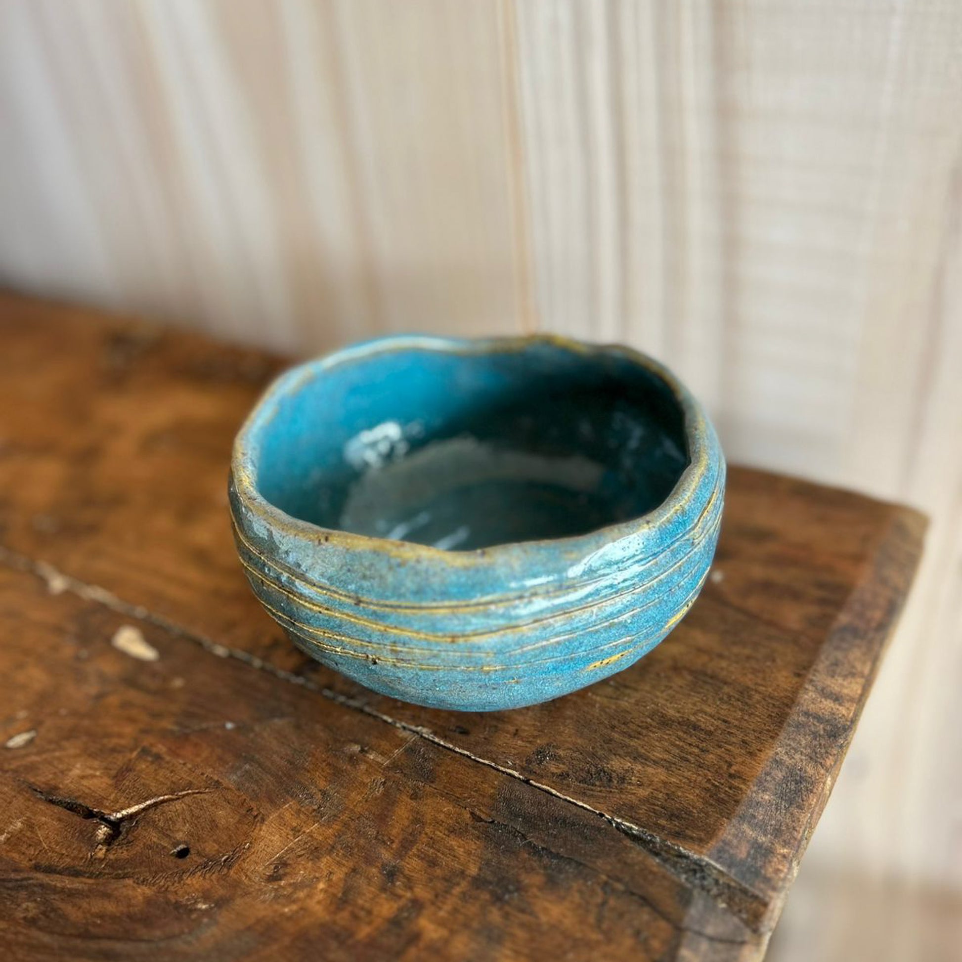 Pocillo de gres hecho a mano color turquesa.