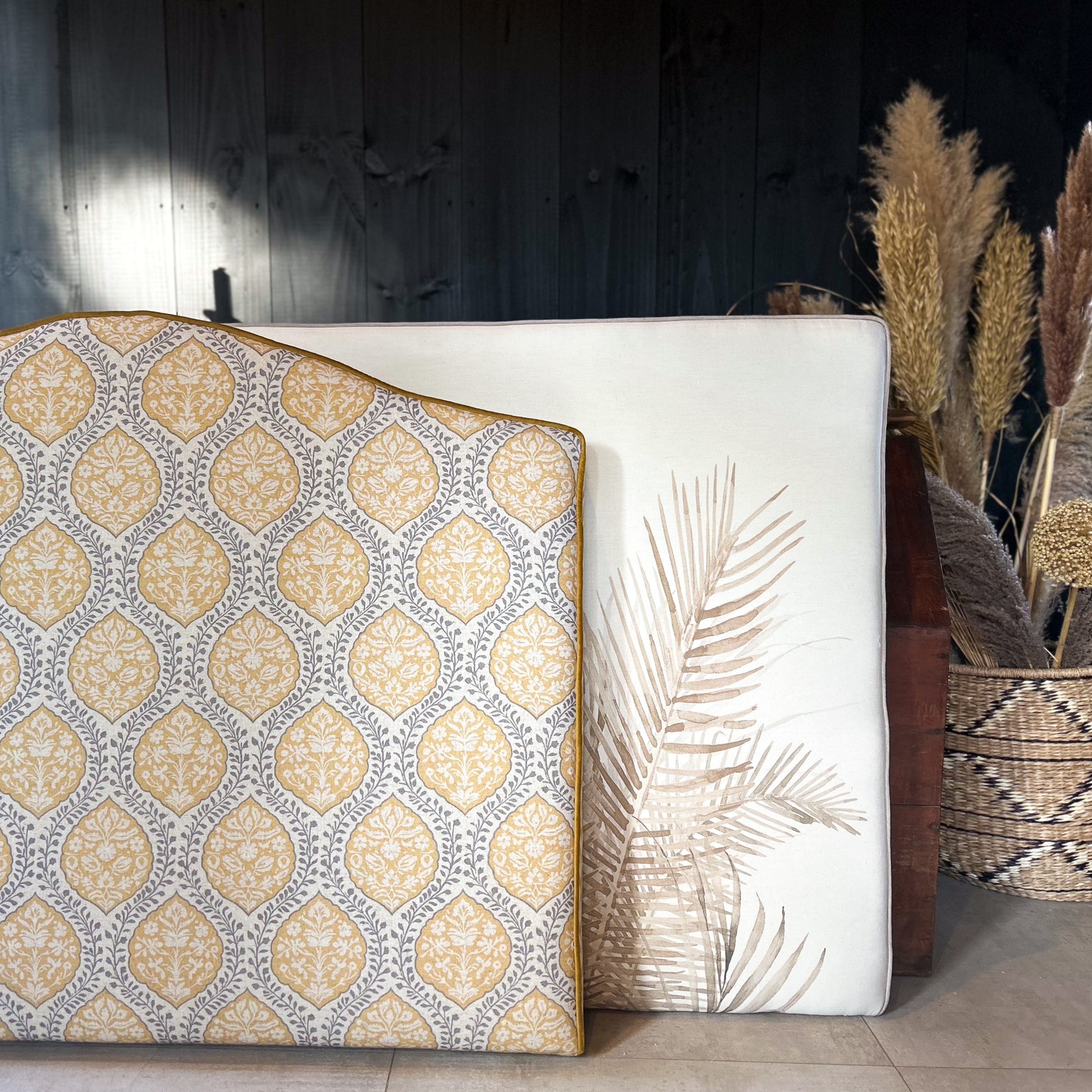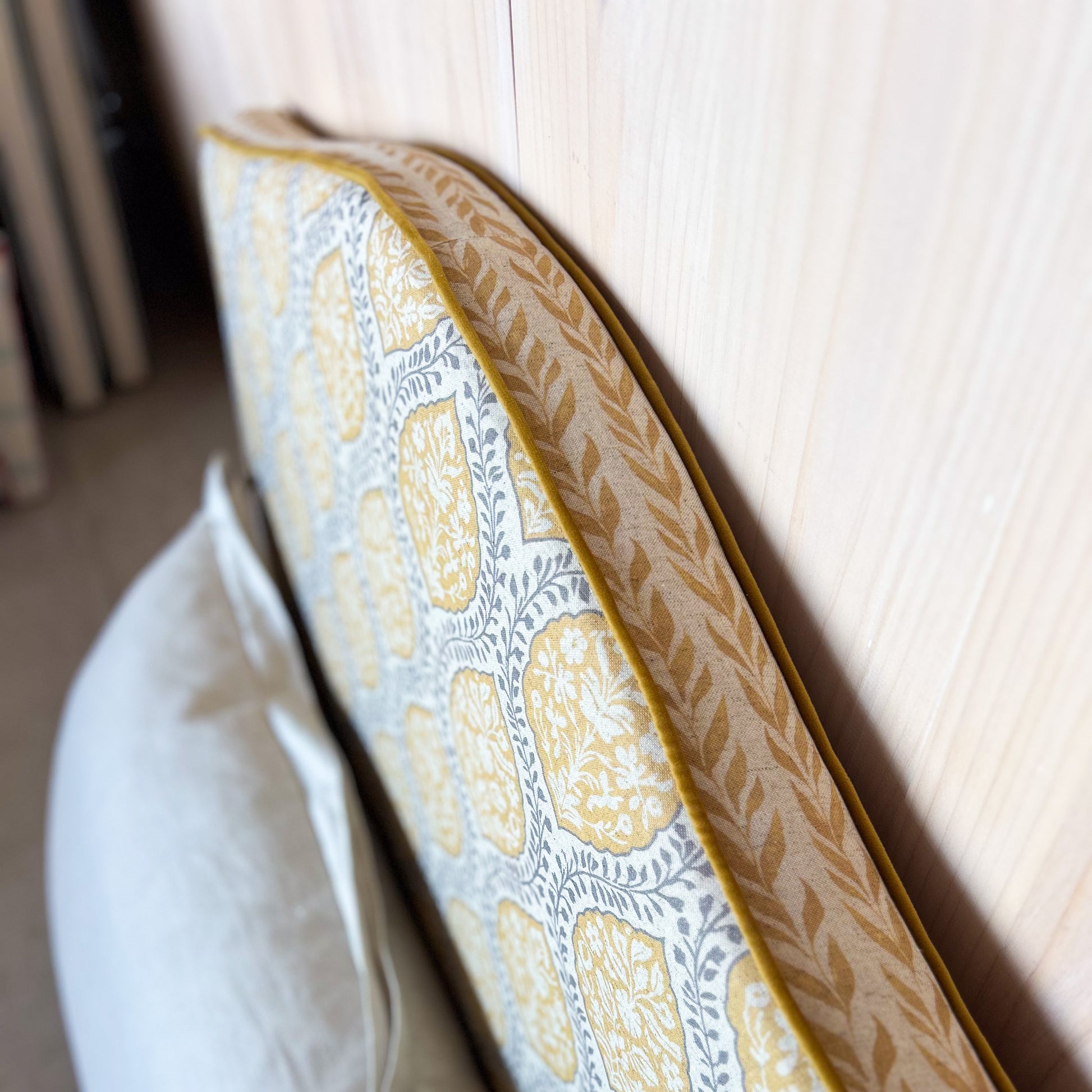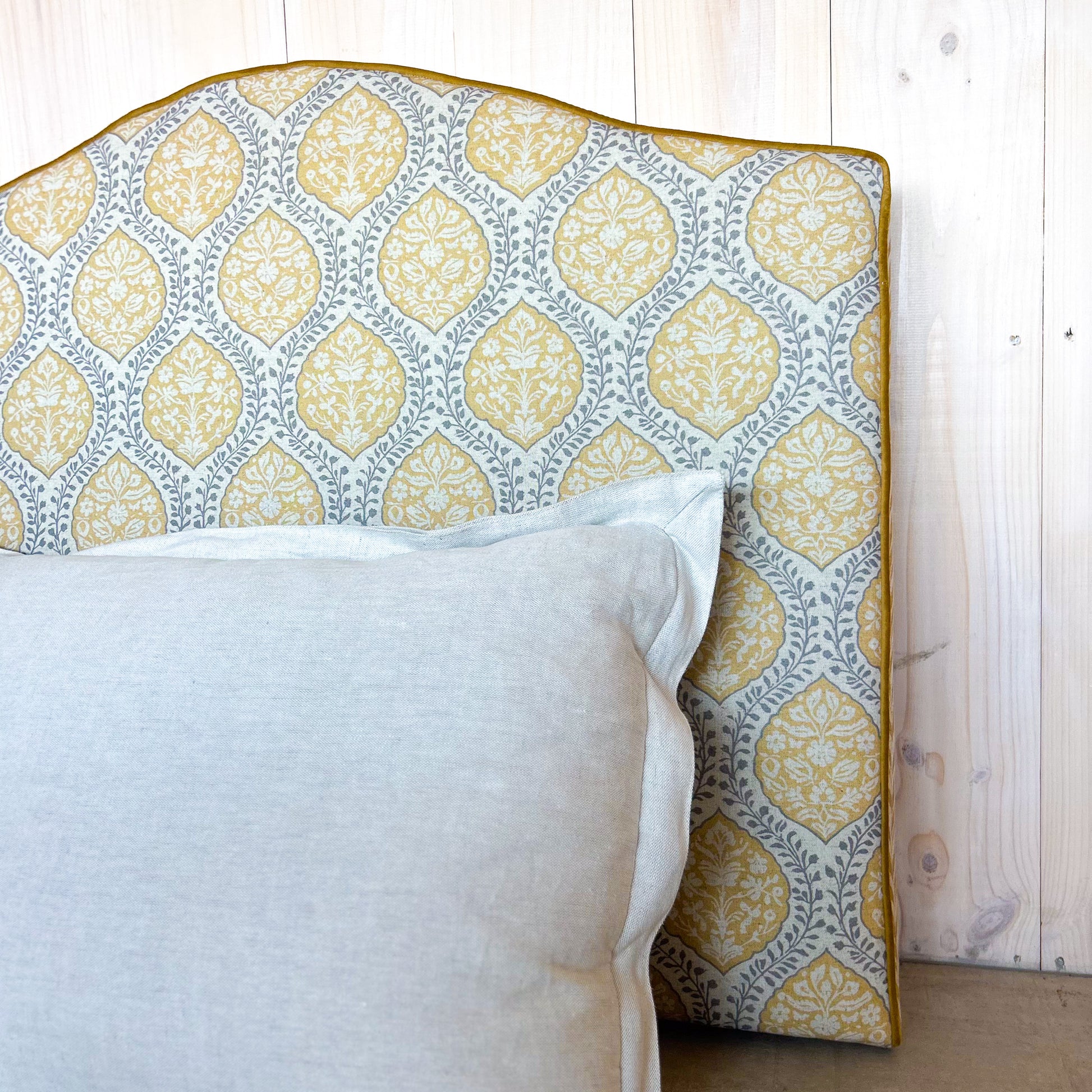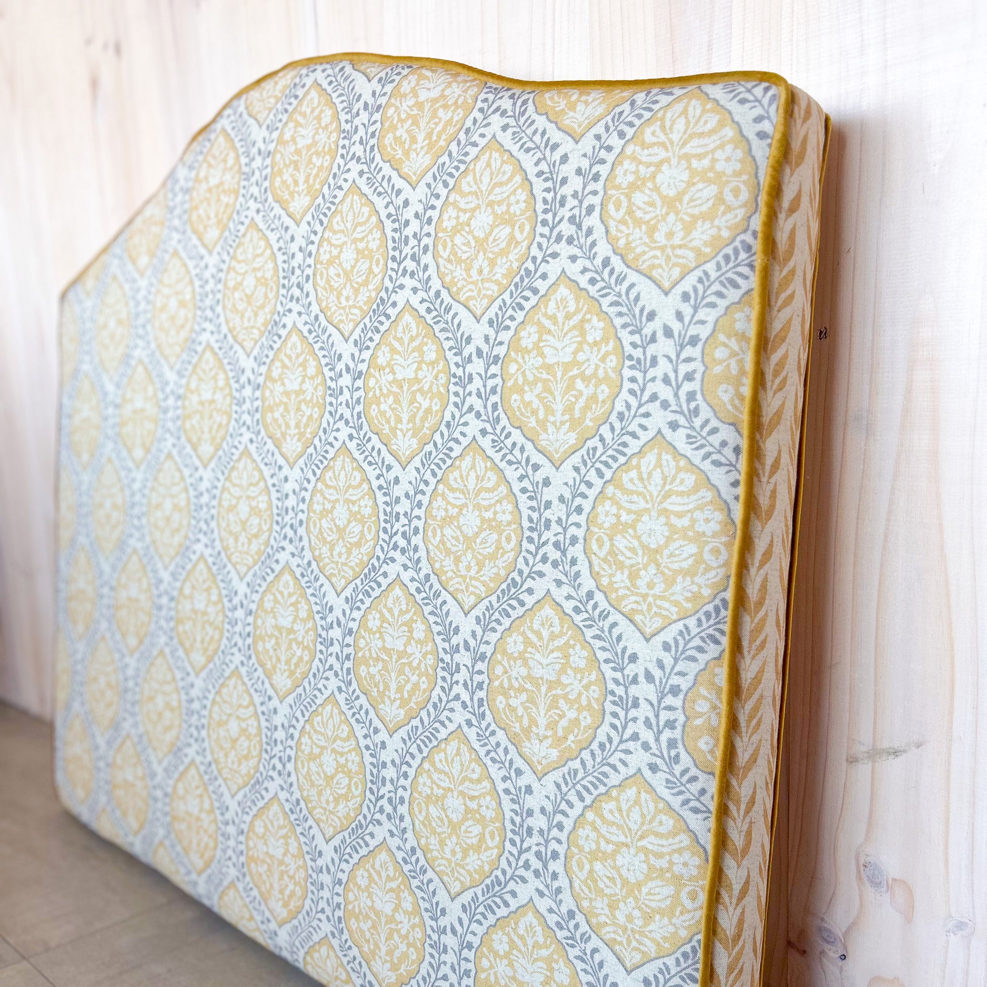 Calidez y alegría para tu dormitorio con este respaldo de 115 cm con diseño de enredadera amarillo, fabricado artesanalmente para camas de 1 plaza y 1 plaza y media.