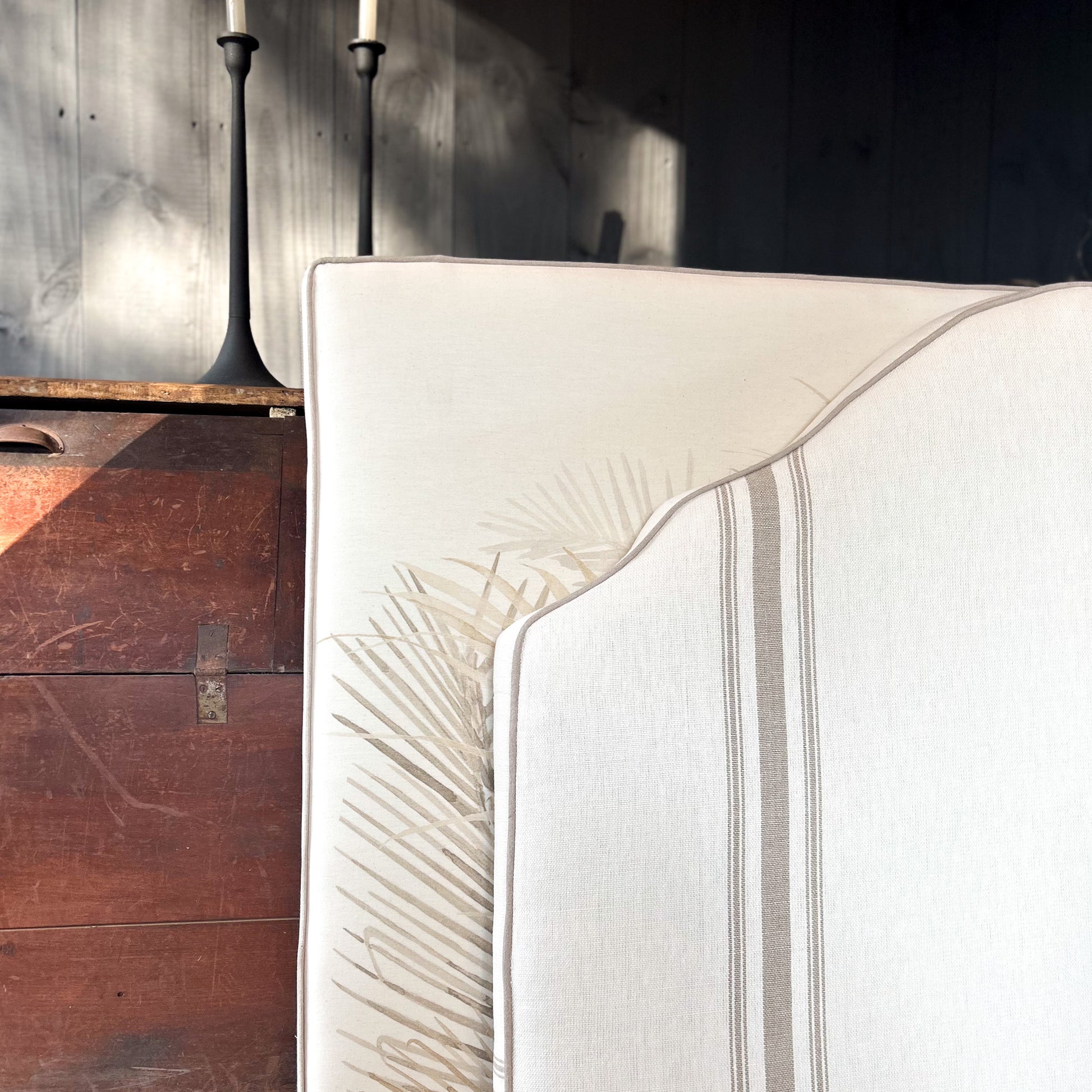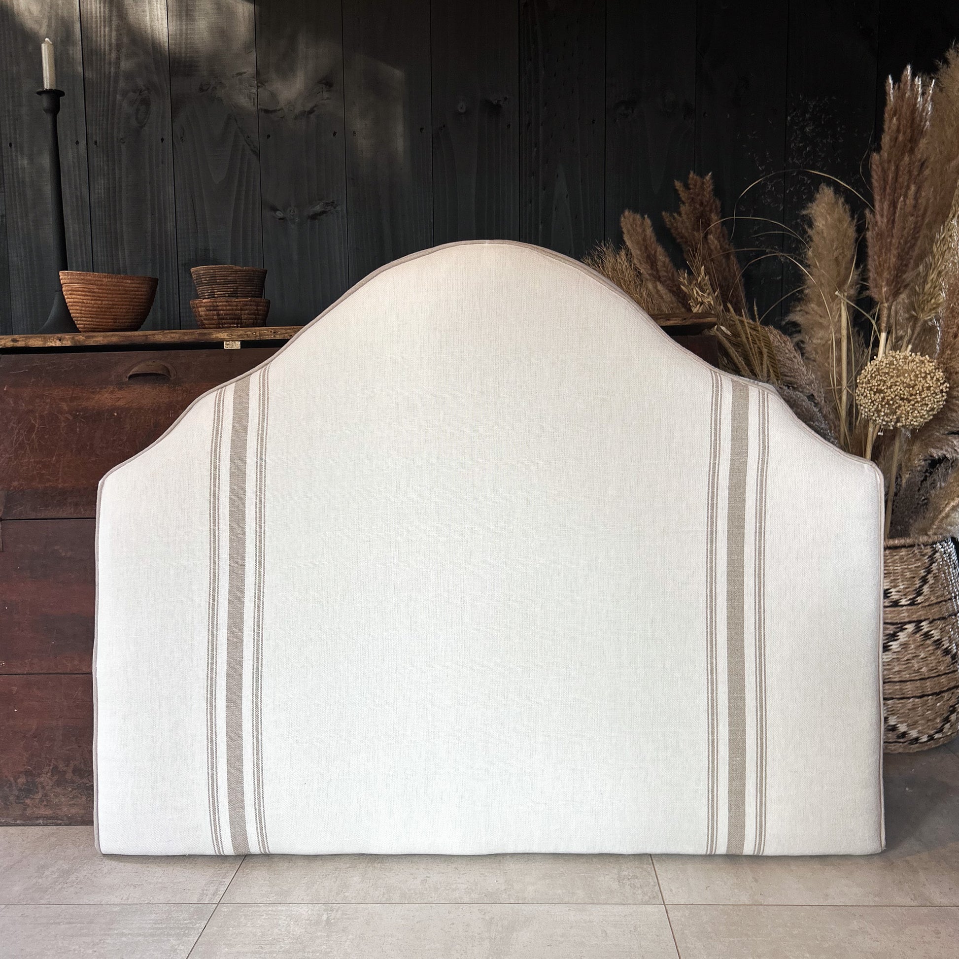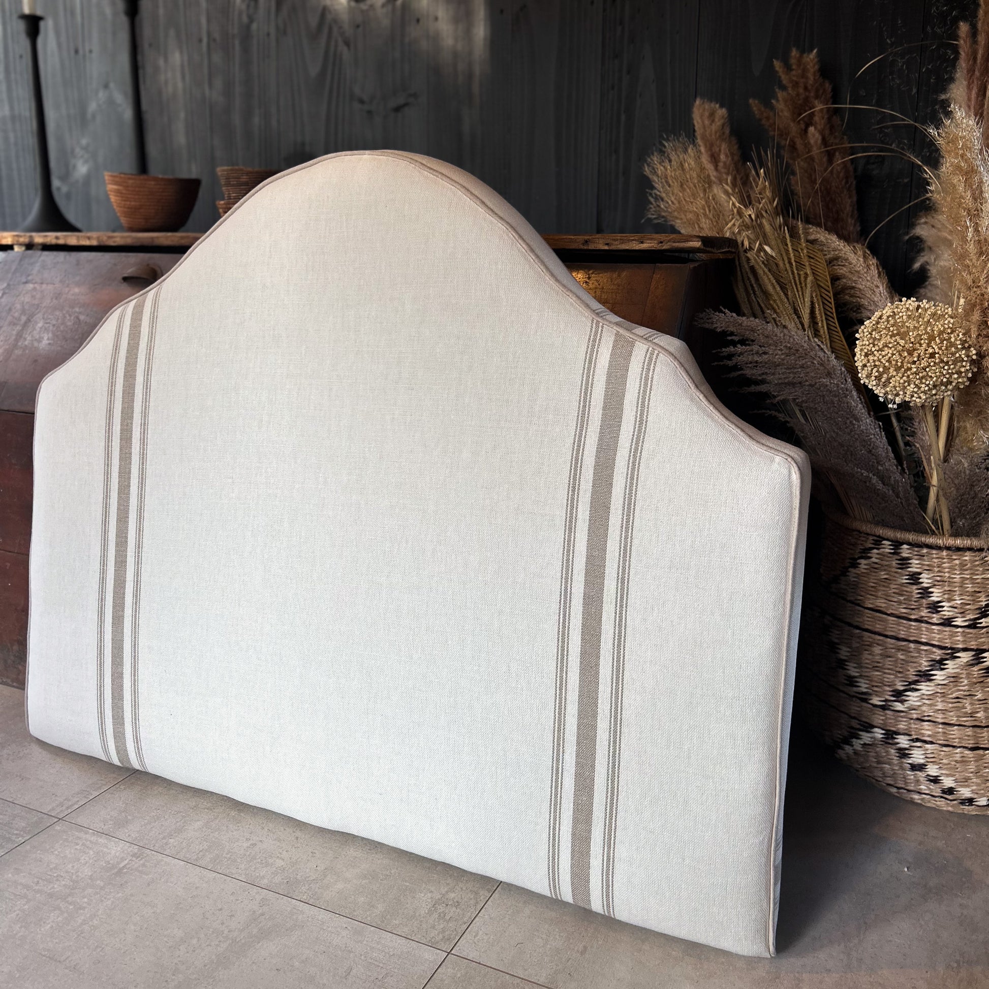 Estilo clásico y atemporal con este respaldo de 115 cm con diseño de rayas crudo, fabricado artesanalmente para camas de 1 plaza y 1 plaza y media.