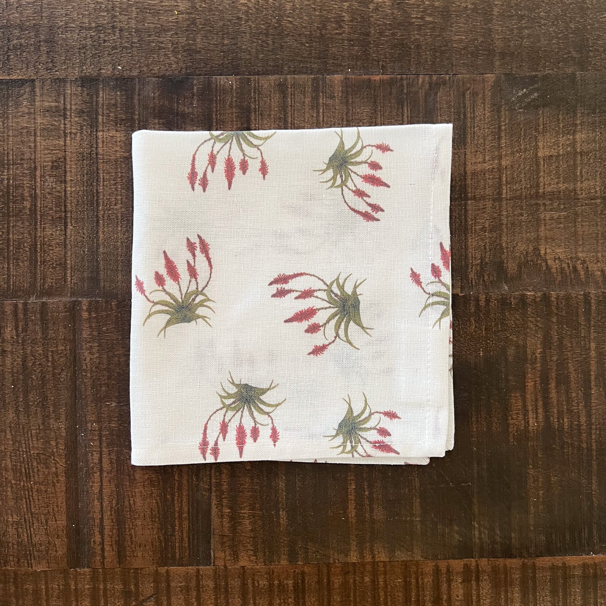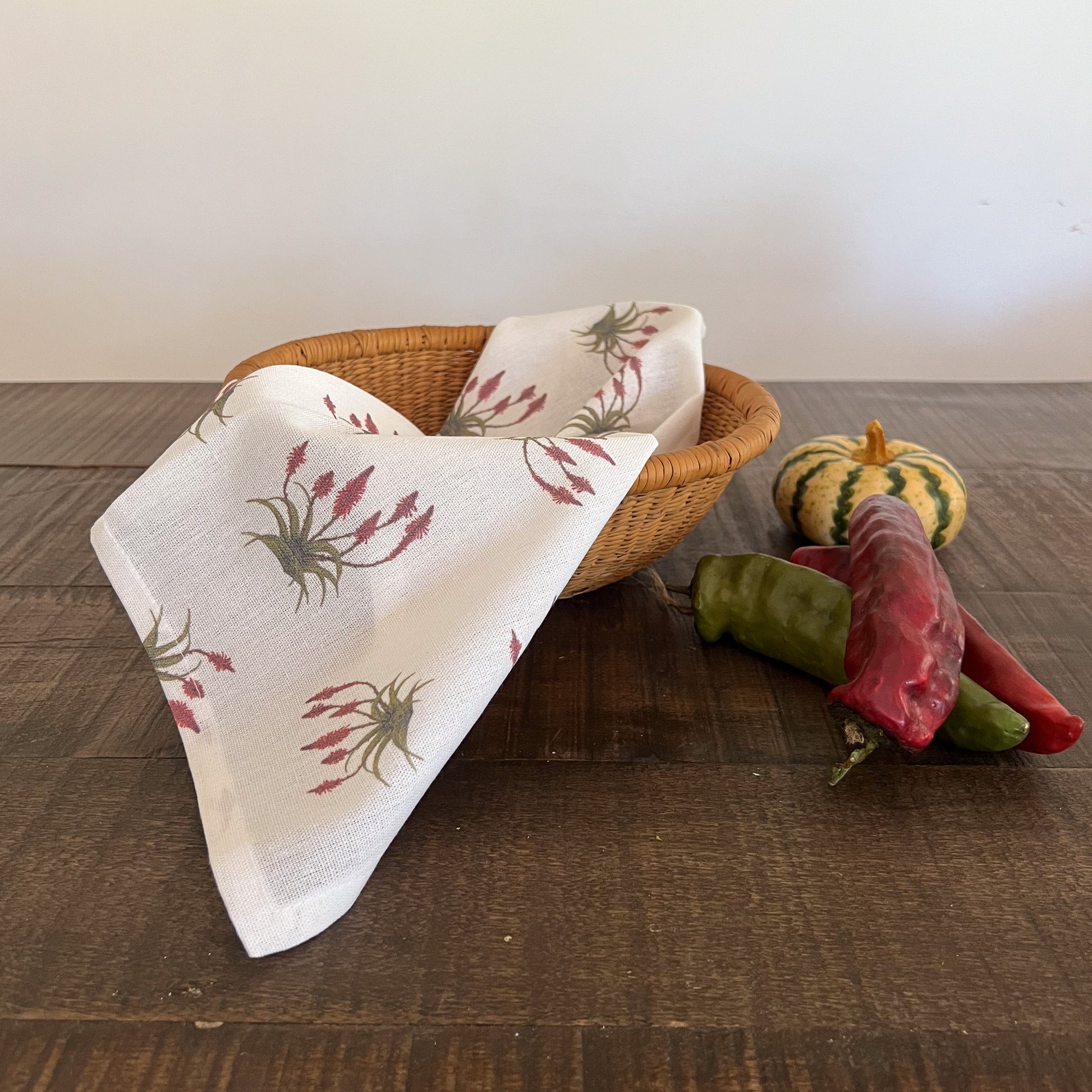 Un toque vibrante y natural para tu mesa con esta servilleta individual de lino y rayón color blanco, decorada con un delicado pattern de pequeños aloe vera de flor roja.